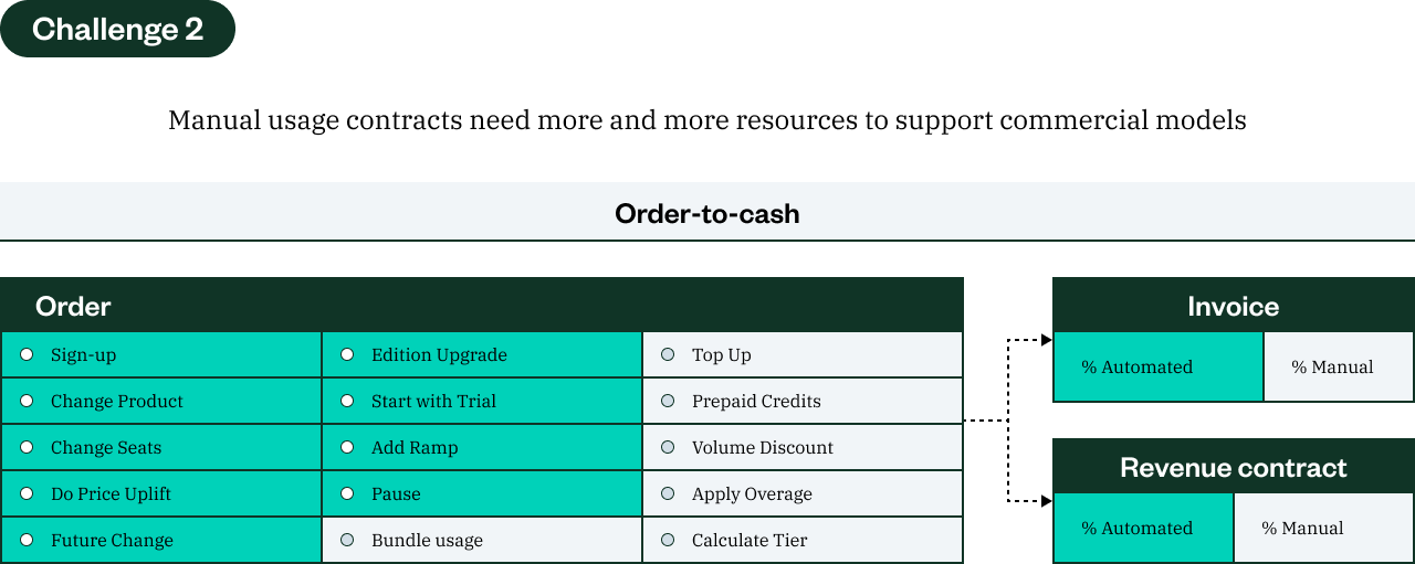 Usage isn’t just a billing model; it’s a gateway to entirely new business models, especially as AI products accelerate the shift toward outcome-based metrics and pricing and hybrid revenue models. But there’s a paradox — while these models offer the greater flexibility and value that customers are looking for (and thus, increase the opportunity for upsell and expansion), they can also be costly, creating a tremendous amount of downstream work for finance teams. As it is, 82% of SaaS finance and accounting leaders are struggling with the additional operational burden introduced by mixed revenue models. And a staggering 97% report that their order-to-cash technology is unable to handle new, more complex pricing models.